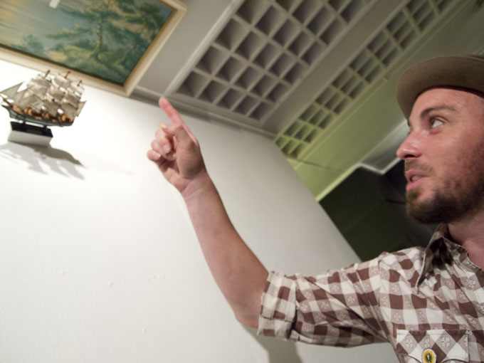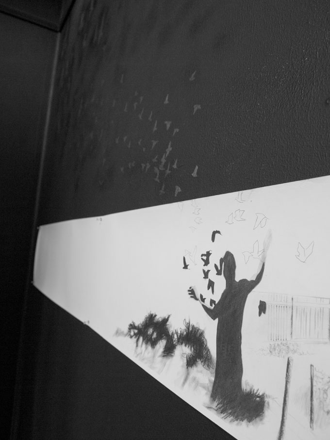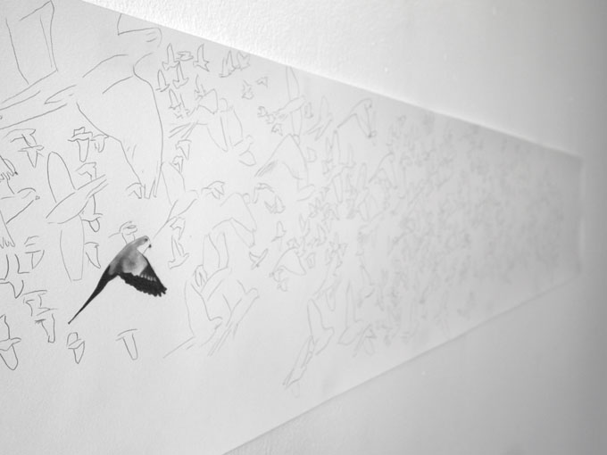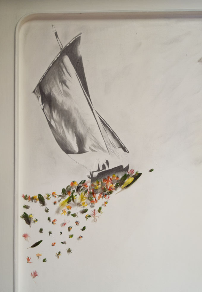The MADE space is multi-roomed, with wooden floor and black and white walls and the two artists have drawn, affixed and assembled found and collected objects. There is no catalogue, no erudite didactic panels, no pretence (or perhaps – all pretence) and no ‘in your face’ message the viewer to be burdened by. Drawings are fixed to the wall, and in some cases, they have been allowed to leap from the paper onto and into the gallery wall itself. A collection of delicate feathers appears to have settled on one part of the gallery wall where its embryonic bird shape morphs into a boat sail. In a mini installation space around 20-feathered shuttlecocks sail through the air before a framed print of the game being played.