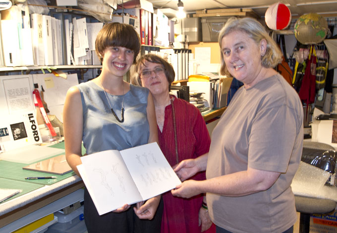 We had a visit from Beverley and Georgia, we shared ideas and methods and secret knowledges on the art of simple binding for handmade books, referencing the notable texts and work of Keith Smith. Georgia showed us her submission for her degree in Bachelor of Design, Industrial Design at RMIT, which she had only recently been awarded as First Class Honours. This unique state handmade book , Wild Order was beautifully designed – its simplicity belied the complexity of the content. Georgia utilized, Riso print, to produce monochrome images, diagrams and texts: black and white some were pale shade of colour eg yellow or green. These delicate and grainy images were astutely placed with texts and diagrams to tell the narrative of the major project the Georgia produced. See www.georgiacharlotte.net