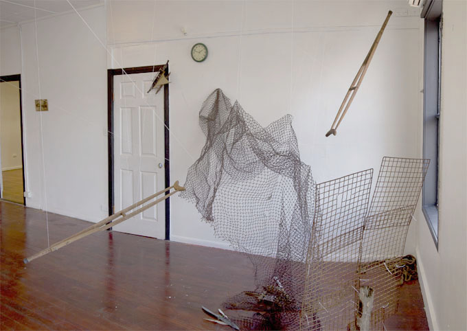 In one corner a collaborative piece consisting of things like ship models a bird covered cuckoo clock, a metre or two of fishing net, steel mesh, a pair of crutches and ancient surveyors strings and ropes. The collaged objects seemed sometimes bird-like and yet at other times maybe even boatish.
