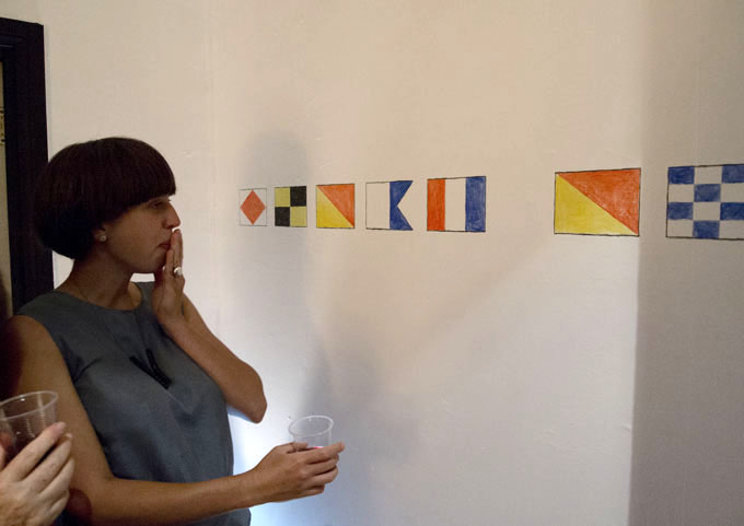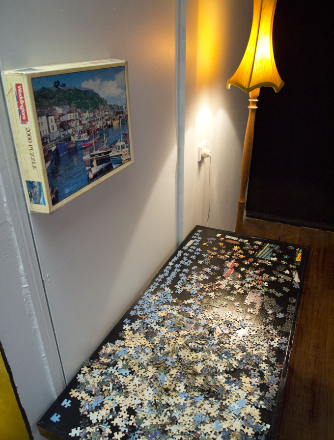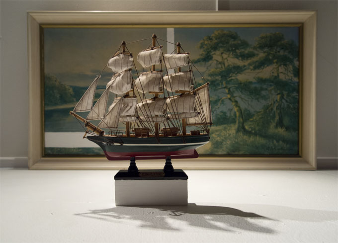 Some collaborative boat works utilise nautical themed things rescued from junk shops and car boot sales. In the context of gallery these objects take on new meanings by the interaction of the viewer. Juxtaposed in the gallery space are boat models, a photo jig-saw, consisting of a harbour full of boats, is presented as a DIY for viewers to attempt to assemble, and a set of coded nautical message flags is presented for deciphering.
