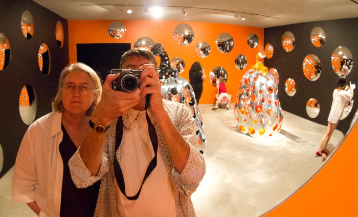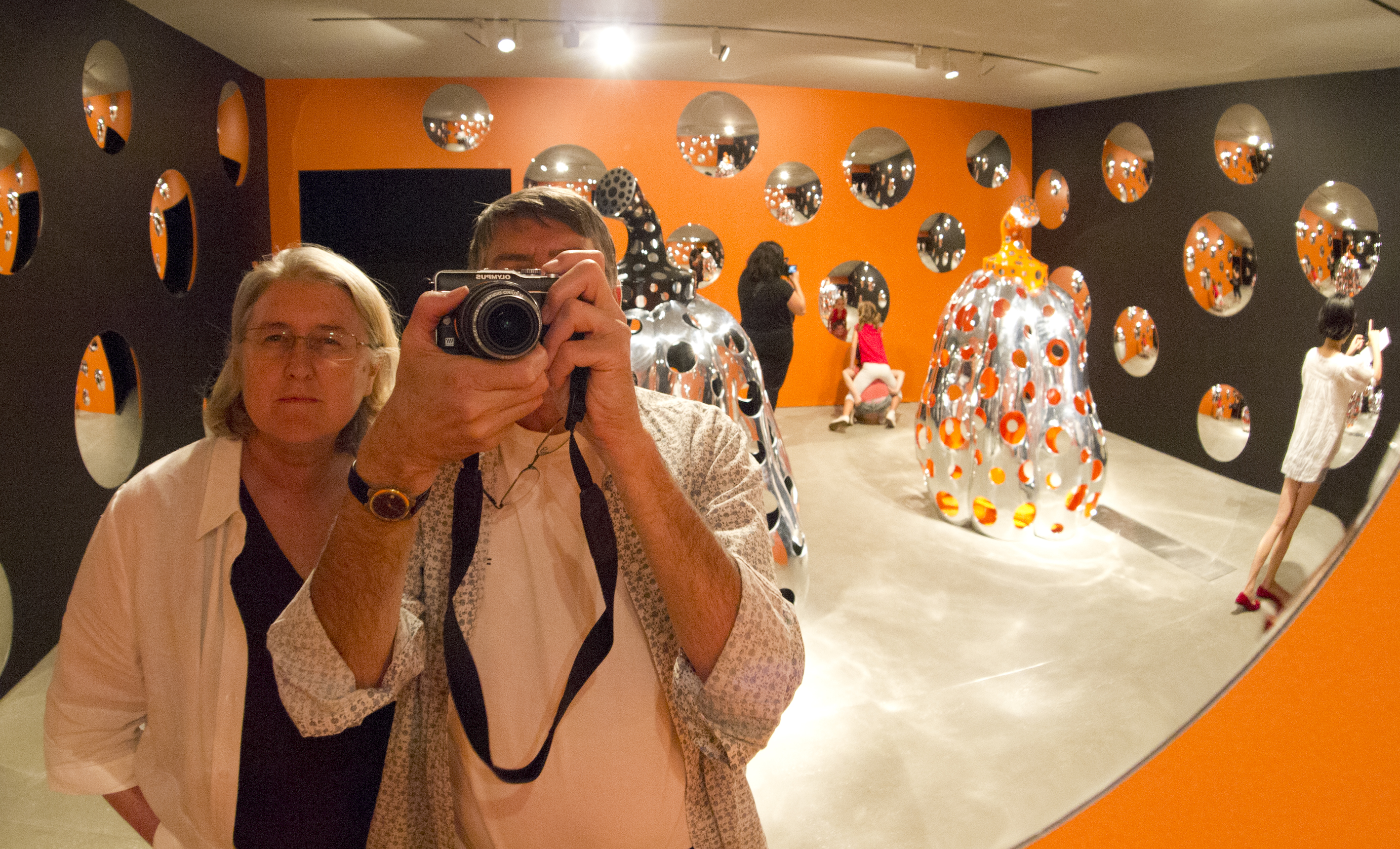 We then entered the Kusama exhibition space. Words alone cannot convey the experience encountered—images and videos may help. And that’s they key to the immersive gallery visitor’s strategy, you are allowed to photograph! In fact everyone is blazing away with cameras imaging their encounter with the art and artist’s wacky view of the world. Somehow Kusama just doesn’t seem weird – she just seems in tune with knowing what the viewer wants!