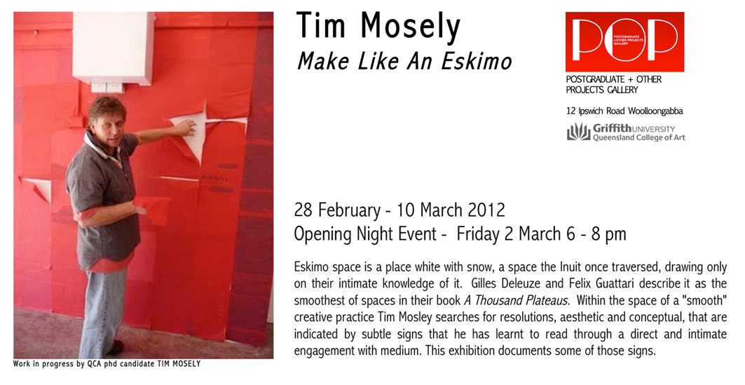 Make like An Eskimo, at first appears as a mixed exhibition originating from many individual artists as each body of work teases out an idea, a gesture, a memory – blurred, or a theme. These are experiments, the research level is PhD so we do expect something that presents a challenge, or expresses a cathartic moment or even a line of questioning that leads … nowhere. This work does not leave this viewer wanting. The stones have been turned over and what has emerged are things that show Mosely’s Inuit traverse of the smooth white space where he has drawn on his intimate knowledge of printmaking medium, of his personal semiotics and his dreams.