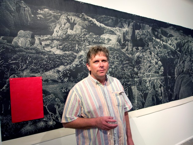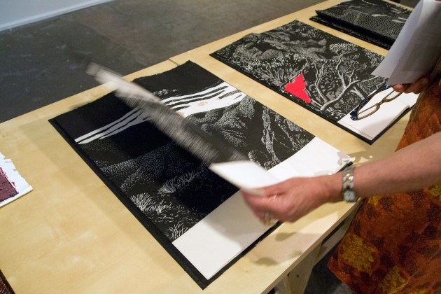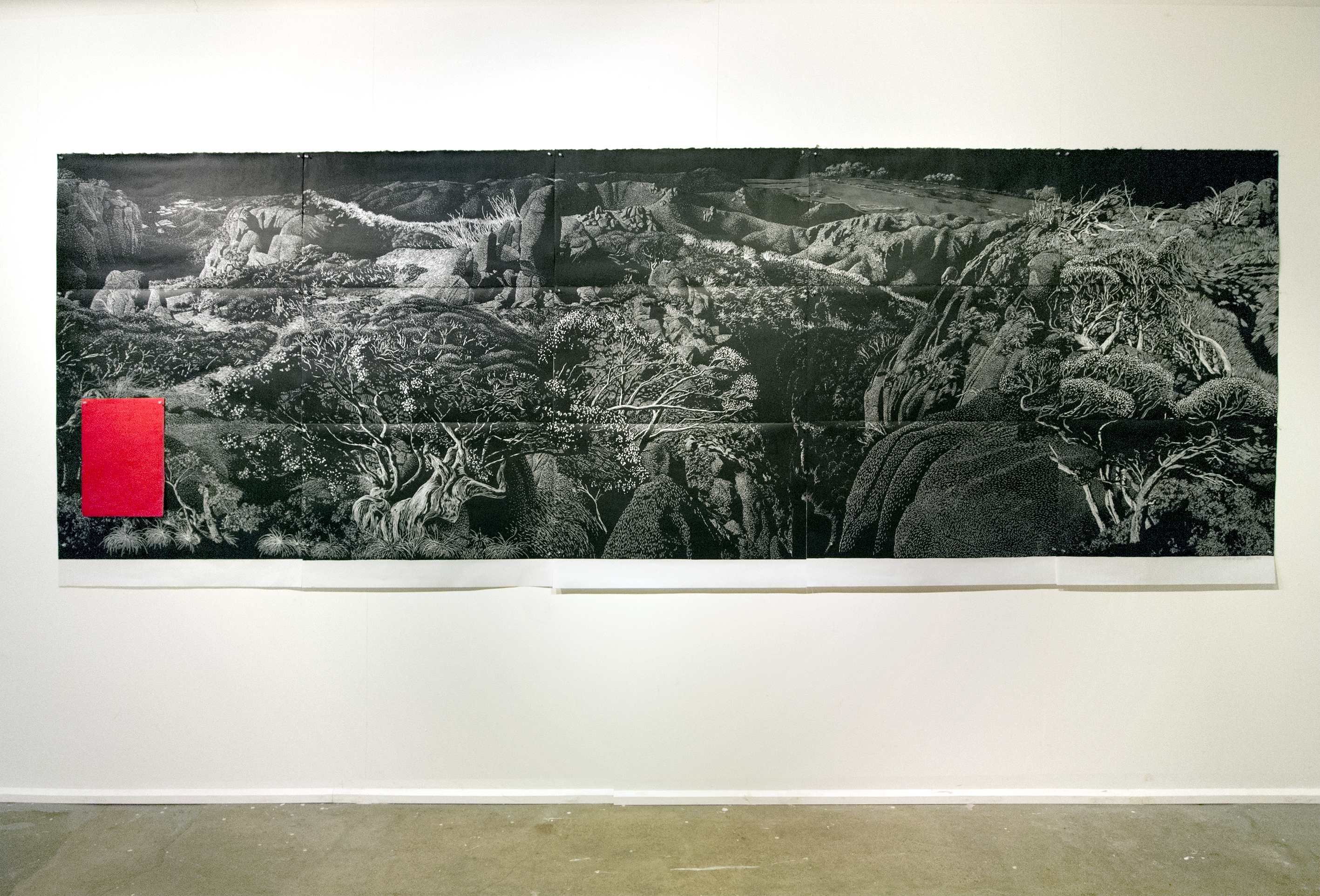 One monumental piece explodes from the wall – imagining mt giluwe. It’s a multi-sheet linocut – dark and brooding with markings made by Mosely’s tools that resemble some kind of tribal scarification. The wild landscape overpowers the smooth white gallery wall and entices the viewer to move in close. There is a hidden map implied by the transecting vertical and horizontal lines of the individual printed sheets. Is it a map of the physical, the metaphysical or is it just mere tactile experience – for touching with the eyes? There is a movement through the monochrome surface and a red rectangle of paper overlays a part of the image – is this order implied over chaos? Colonial blood over Nature? Or could it hide a didactic code with its intention to perplex the viewer – or maybe it is there to just hide the fact that no code exists?