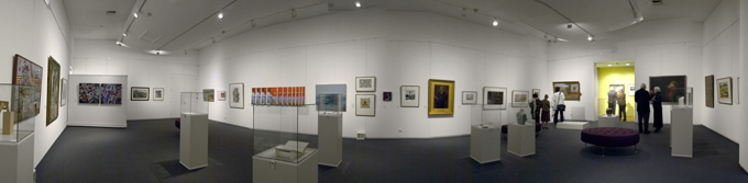 The exhibition features 75 individual artworks from the gallery’s collection—one for each of the 75 years. Standing in the middle of the main exhibition area one sees a diverse range of visual material. Paintings of bygone and contemporary eras by some very prominent artists, there are ceramics, fine jewellery (from the gallery’s principle collection media—contemporary wearables), and finally photographs and prints complete the veritable visual cornucopia on show. When I came to testing my recollection of the artwork’s titles and artists I was stumped, as the artwork didactics bore none of that information. This presented some confusion until I became aware the curatorial strategy for the show. The 75 works were selected on the basis of the year and the work’s conceptual connection with significant social, political or historical aspects of that year. The key to the sometimes quirky and idiosyncratic curatorial selection is the exhibition catalogue in which the rationale for the selection is linked with the title, media and the artist’s name.