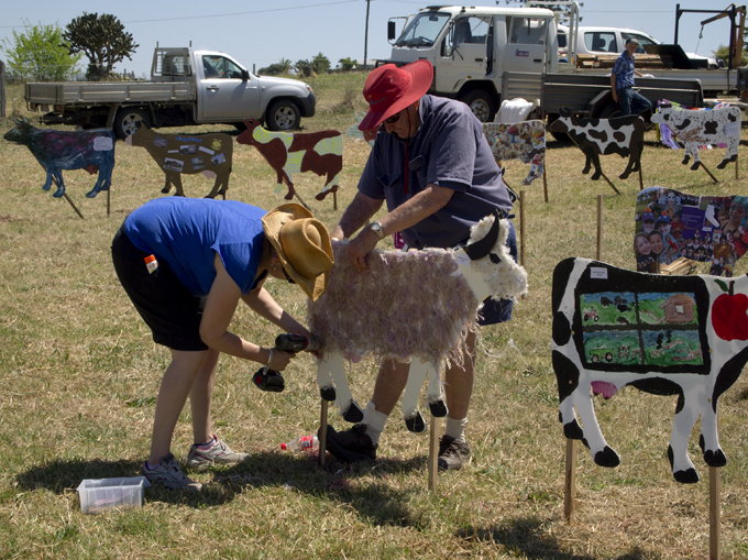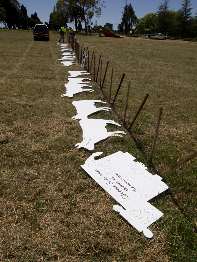 On Friday we took our artwork, the CondaMINE Cow, Variety: Thylacine (SEE previous post) out to the paddock to join up with the herd. Here are some images of the setup underway…