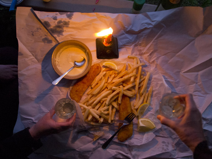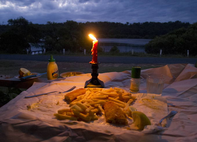 ANTIDOTE #5: DINNER – FISH ‘n’ CHIPS out of the paper with lemon slices, mayo, flaked salt from the Murray River and a New Zealand Chardonay from Marlborough Sound.