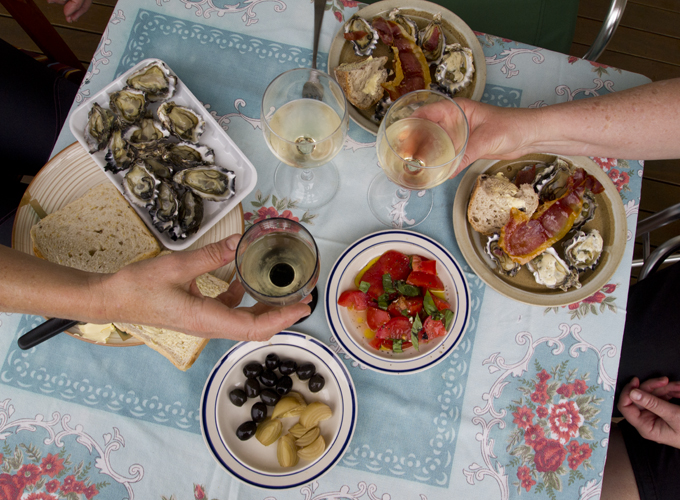 ANTIDOTE #3: A LUNCH of OYSTERS – Kilpatrick, with capers and mayo and au naturel with sourdough bread and fried prosciutto accompanied by a small glass of Verdelho white wine.