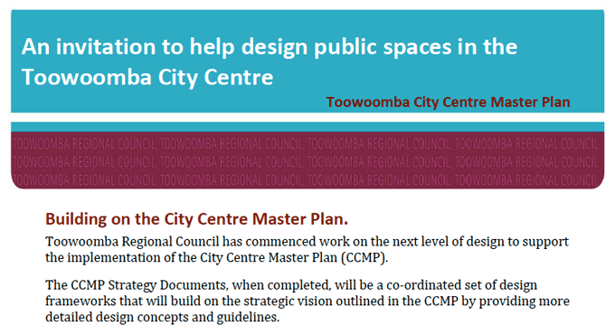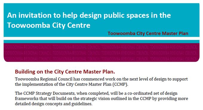 [1] From the invitation ‘Help design public spaces within the Toowoomba City Centre’