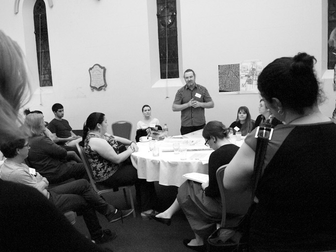 On another table the topic of Open Spaces was discussed with Peter Richards, Director of Deike Richards, a Brisbane based multi-disciplinary design practice. The members of the discussion group included many urban planners, architects, councilors and artists. Topics discussed looked at traffic flow, tree-lined boulevards, redevelopment of large blocks including the City Hall precinct, ideas for the Toowoomba Foundry site, bikeways and the repurposing of car parks into greenspaces. Suggestions for the Foundry site included a market like Melbourne’s Victoria Markets, as well as an artist’s studio precinct and a GOMA/MONA-like gallery—could it be called “TOGA–TOowomba Gallery of Art?.
