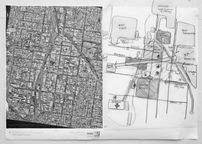 Vicky joined the table discussing the laneways and Public Art projects, which was directed by Brisbane art consultancy and project management group, Urban Art Projects (UAP). The discussion identified important Toowoomba Spaces: The Chronicle Arcade, Bell Street Mall, Duggan Street and general laneways and pathways commonly used to flow through the city. All agreed that the West Creek needed to be acknowledged as an important feature of the city.