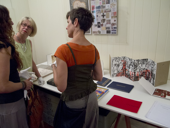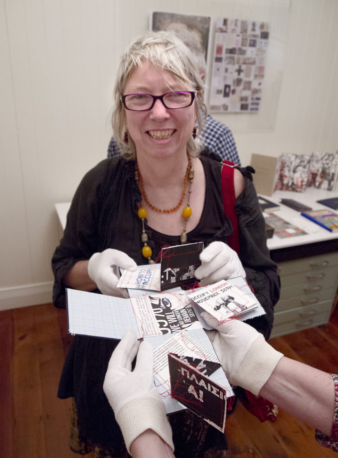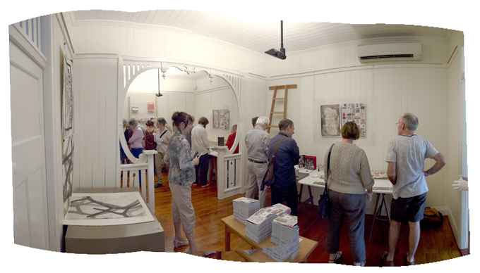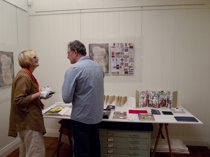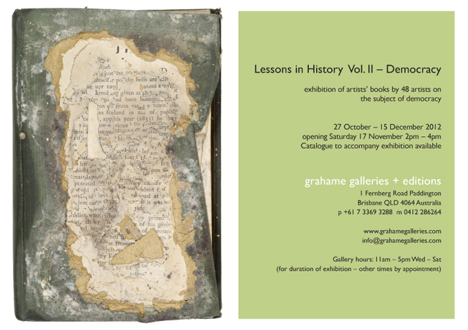 In an otherwise drought of artists’ book activity in Brisbane the opening of the much awaited exhibition at grahame galleries Lessons in History Vol. II – Democracy provided a welcome spike in calendar. In one brief afternoon there was the opportunity to be swept up in a deluge of books and book people. This is a the democratic camera view of the event …