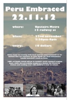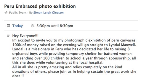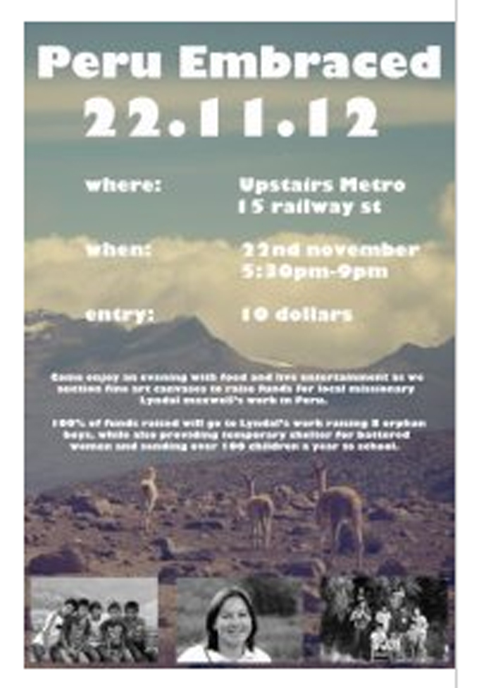 At the opening the works were auctioned generating around $4,000 for an amazing lady Lyndal Maxwell who cares for and adopts Peruvian children. Simon’s message is presented here …