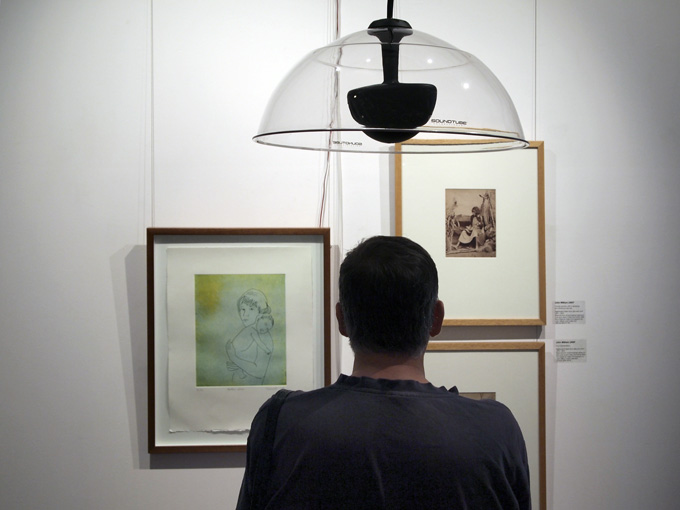 The Art of Sound offers a new way of presenting visual art in a gallery space. The concept is to pair works from the GAG collection with audio material supplied from the National Film and Sound Archive so that the viewer of an artwork has a sight and sound experience of the art. On entering the gallery space the visitor is immediately met with the usual artworks on the wall but something is different—each has some kind of parabolic Perspex dish suspended above or headphones nearby. These sonic devices deliver, in a fairly localised way, music or audio to compliment the work. Composer and sound/artist designer James Hurley undertook the installation of the audio apparatus at GAG.