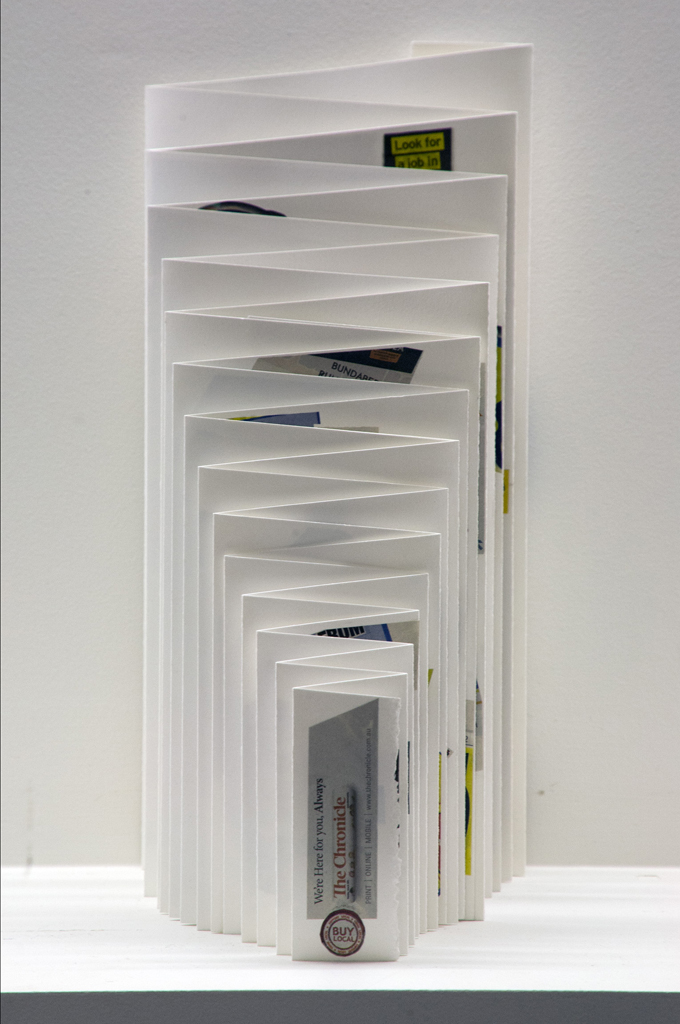 My book Have you got your Chronicle today? makes comment on how the tabloid newspaper is reliant on the advertising dollar to support the necessary communication of the daily news. This artists book is a mashup of the news with advertising. The collaged elements comment on content and the way the reader is directed by the newspaper design through the placement of advertisements, journalism texts, photography, community notices and sport. After deconstructing the newspaper, the book’s form changed as new associations of text/image/graphics determined the new structure. The flow through the book matches the newspaper it parodies as it also can also be folded flat for post-reading storage. Details and images of the book and its construction follow – Enjoy … Doug