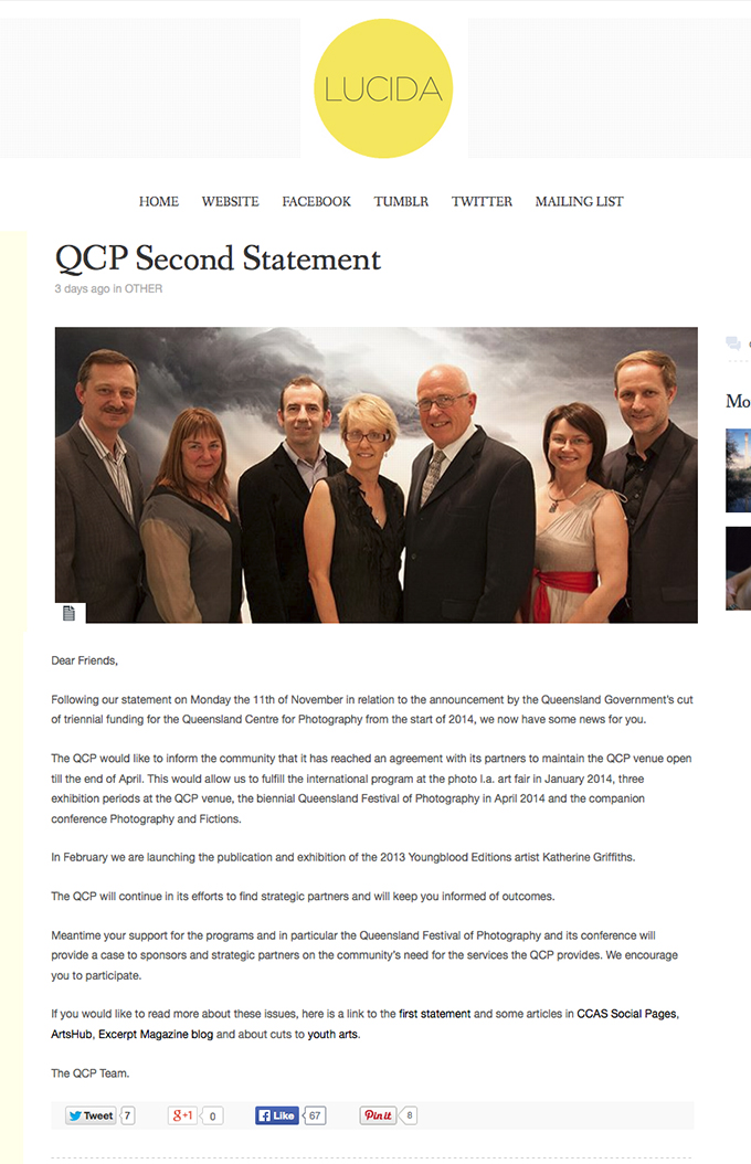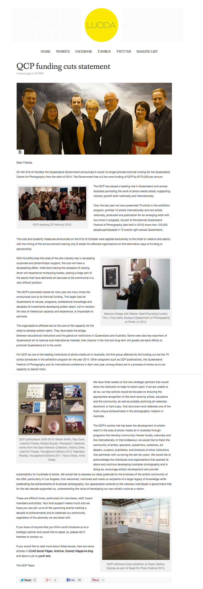 THE QCP HAS BEEN ABLE TO NEGOTIATE SUPPORT TO CONTINUE ALL PROGRAMS AND PROJECTS INCLUDING THE QLD FESTIVAL OF PHOTOGRAPY, LA ART FAIR & CONFERENCE UNTIL THE END OF APRIL 2014