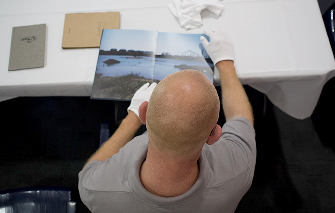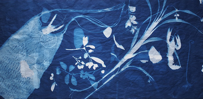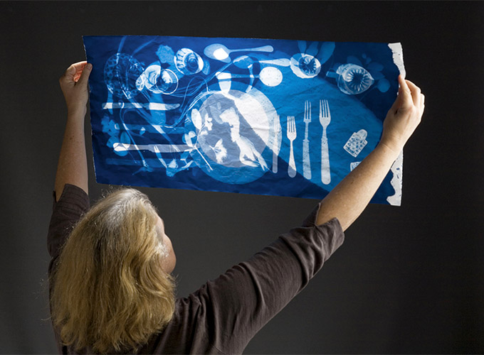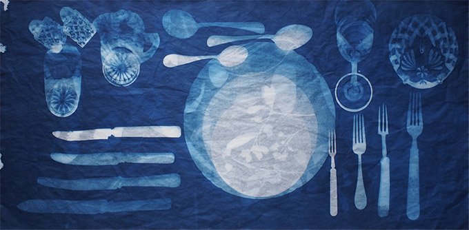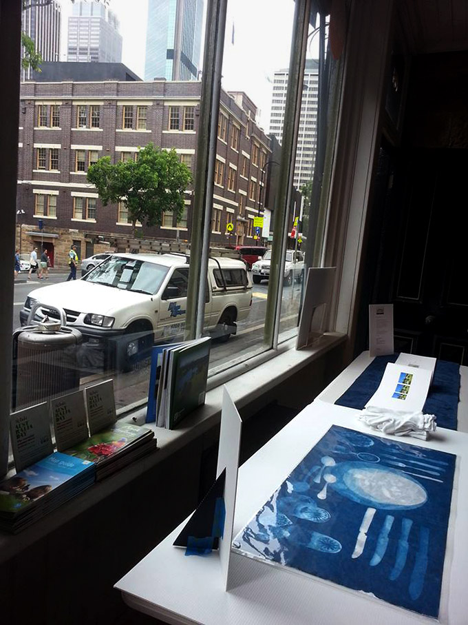 The collaborative book, called Australian Banquet, January 25/26, 1788 (variant #5), is a double-sided broadsheet cyanotype in rice paper, 37.6x77cm. There are 7 unique state variants of this work.