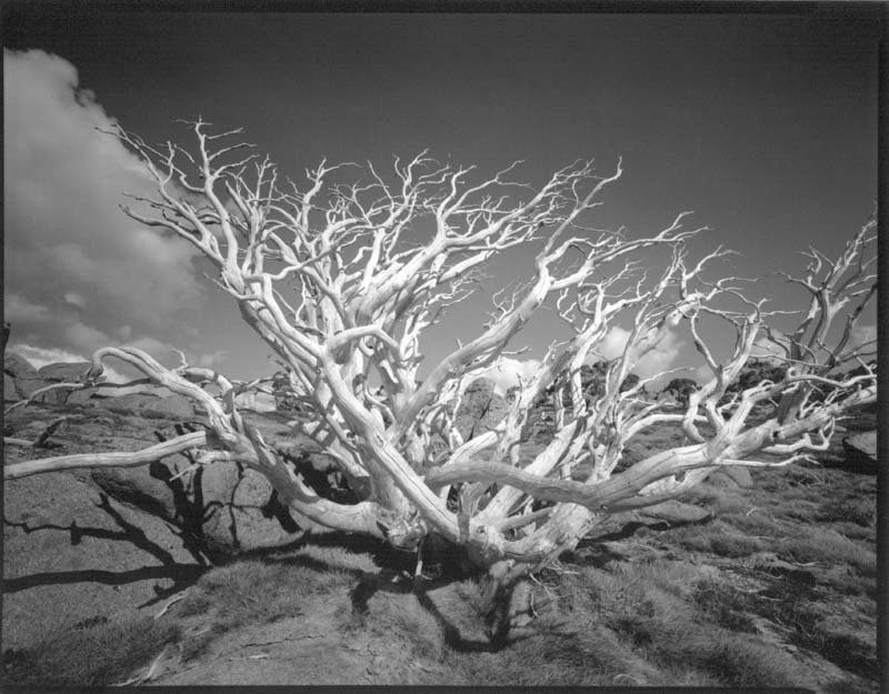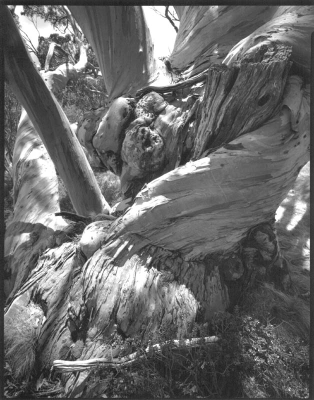 To bring an Australian light to the large format photograph Maris and I set out on a road trip from Brisbane to Canberra, Kosciuszko and Suggan Buggan in the late 1980’s. On this journey we shared rooms in cheap motels and backpackers, red wine and erudite conversation. Loading large format film holders in the cramped spaces of motel wardrobes and borrowed darkrooms we ventured into the high country and along roadsides. Photographing in the field was in part an endurance in the sweltering heat of mid-summer’s noon-day sun under the focussing cloth, and the privations of only being able to make 6-8 photographs a day – but each image was unique… a triumphant moment… a personal vision of light.