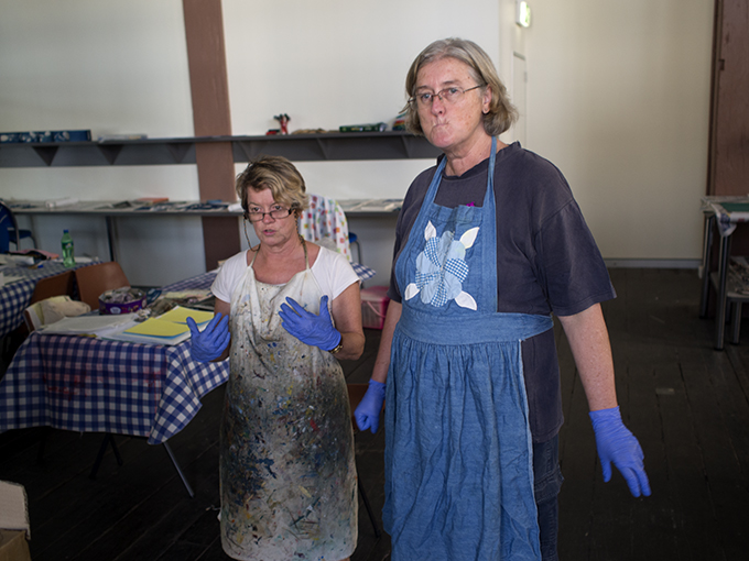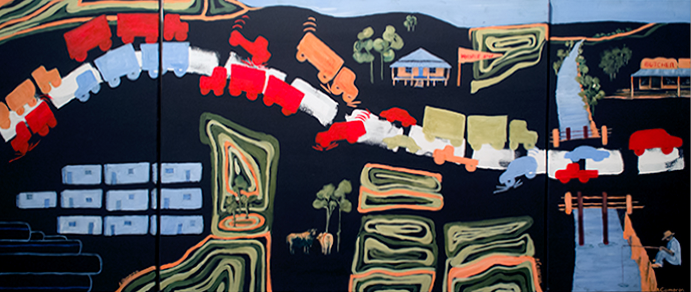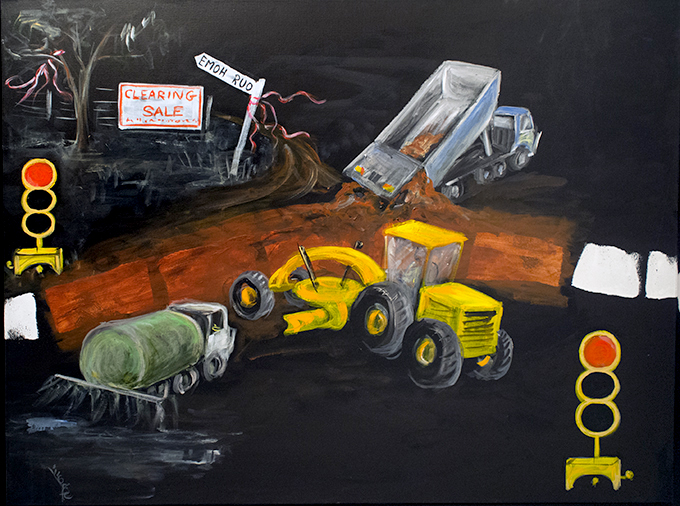 The 6 Artists from out of Nowhere are country people connected to the land. Their lives and livelihoods are being challenged, by the demands of mining to access and transform land use and also transform the once familiar and reliable road systems. The artists are not happy with this situation. They state: ‘the highway has become so busy and so dangerous that we felt compelled to comment in paint.’ The exhibition is simultaneously a report and a shout for an improvement to the circumstances of those who no other option than to use this thoroughfare.
