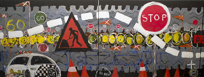 As the gallery visitor travels along the highway artwork, familiar symbols, signs and fleeting glances of things that flit past one’s eyes when travelling at 100 kilometres per hour emerge. The artist Barbara Hancock has painted an endless line of lollypop stop-go men and women who demand your courtesy waive or salute ‘thanks’ as you allowed to proceed. Traffic lights enable a quick drink, or a check of phone text messages, or just time to contemplate the journey. While in the rear-view mirror a shimmering chrome grille and bull-bar of the huge road train rumbles behind you in the queue. Orange-capped witches hats sit comfortably along the edge of the road, in this case the canvas, and a police car decked out in harlequin waits and waits … Stop, DETOUR, STOP!