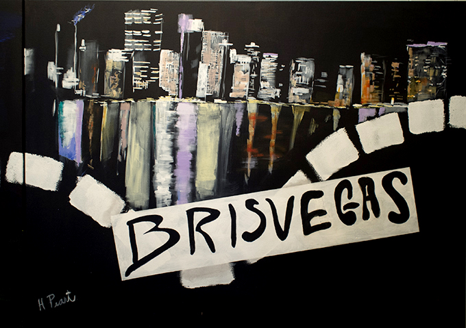 Allen’s bold and provocative canvas road ends at Helen Peart’s simple high key painting of a road view. The limited yellow and grey palette contrast the black and red of the last section – the speed sign says 60kpm and a sunset in the west viewed from the rear-view mirror ends the day. The dark night follows where the bright light chimera of a truck’s of lights zooms past. We are nearly at the end of the road and the reflected lights of the big city, entitled BRISVEGAS, seem almost placid in comparison with what has been experienced in the gallery journey. Is the big city aware of the struggle and the price paid … would they care?