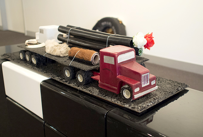 On a plinth in the middle of the gallery floor the sculptural forms of two trucks by Wally Peart pass each other on a highway. One carries pipes for the coal seam gas corporations, the other carries products on the land – their paths cross only millimetres from each other and yet the narrative of each is something that is shared only by the presence of the road.