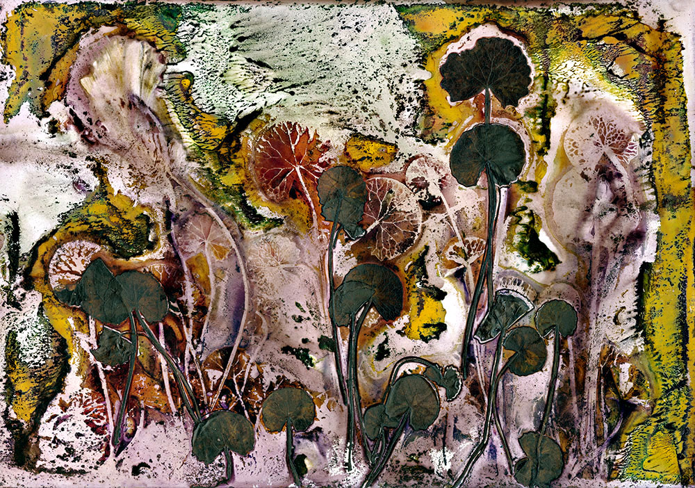 Through her Biochrome process Buziak visually explores the complexity–sometimes messy and chaotic–within the lifecycle of plants and the ecological systems that sustains them. Within the process, and evident in the final works, is the agency of borders, boundaries and edges. It is at the edges of the plants from the leaves and stems down to the cellular level that vital exchanges occur between life, death and decay. Buziak also works in the generative but slippery space that traverses the boundaries of art and science, culture and knowledge.