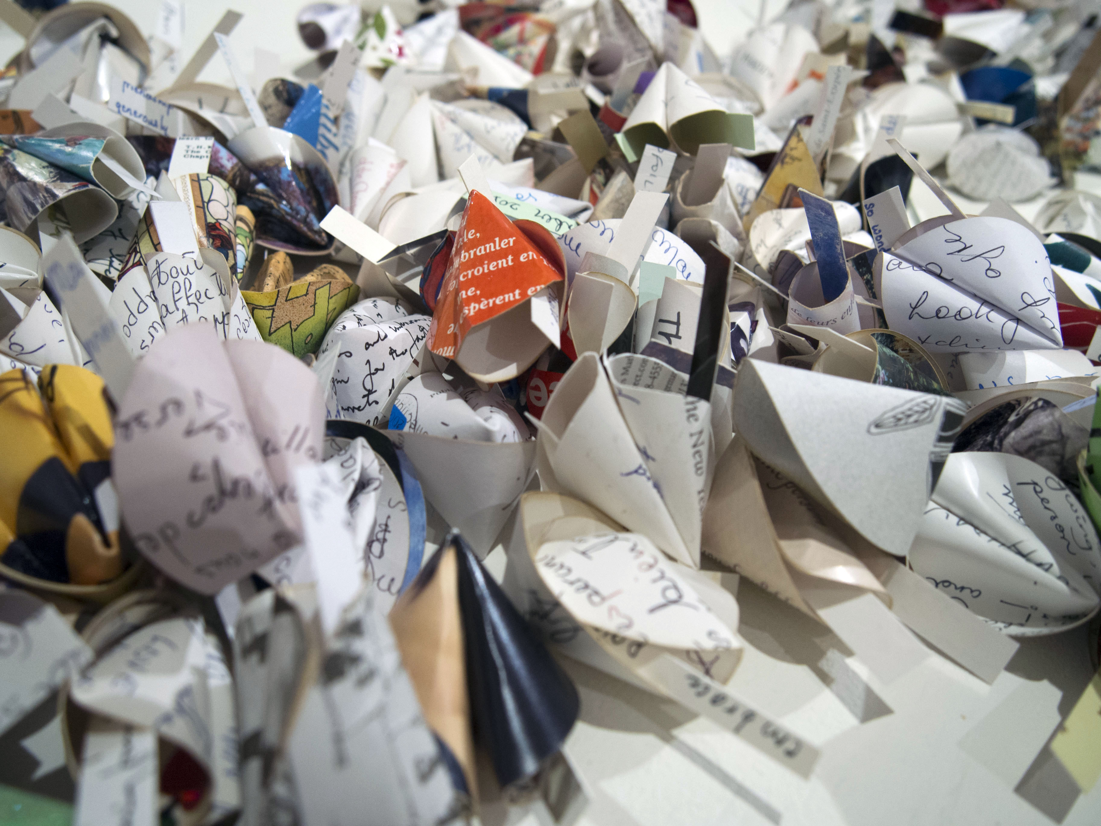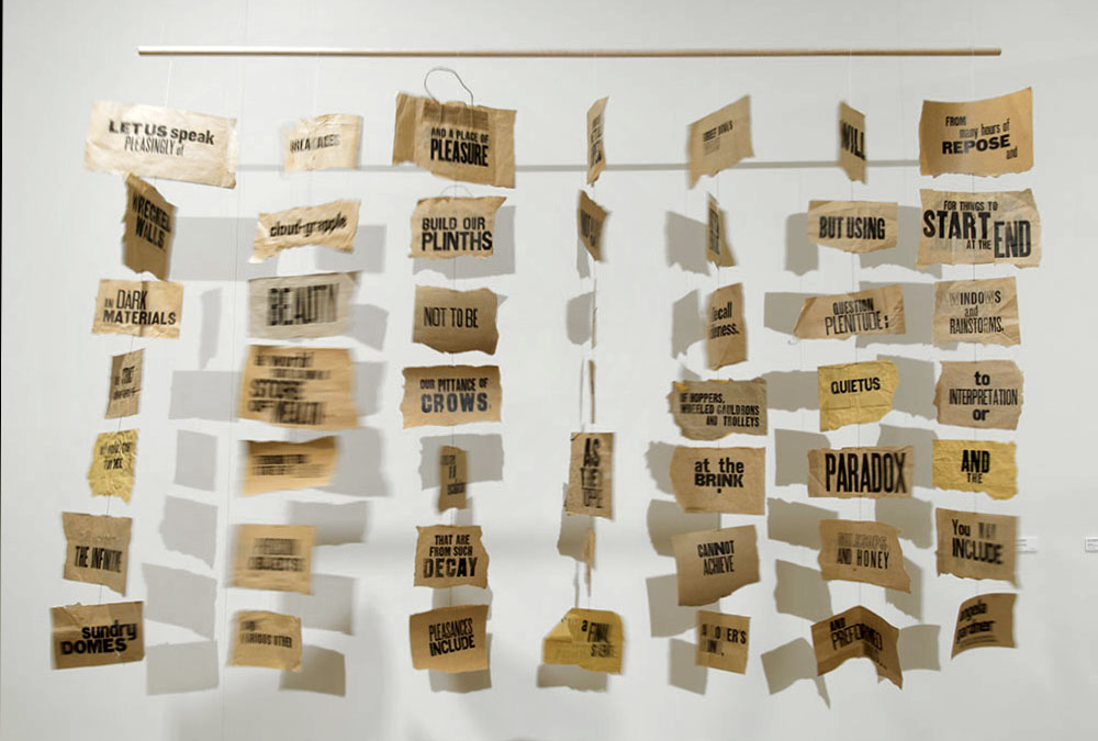 In my opinion some books call for special mention. Caren Florance’s Pleasure demolition is transfixing. The suspended brown paper sheets with a hand printed letterpress phrases from poetry by Angela Gardner are animated by the flow of air and movement in the space. Forever moving, the oscillation of the pages becomes a machine for the generation of concrete poetry… phrases twirl and merge, poetic moments where new meaningful/less messages materialise.