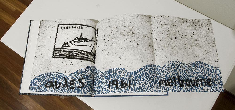 After much soulsearching I decided to allot the winning entry for the major prize to a collaborative and fabulous artists book by two Melbourne‐based artists, George Matoulas and Angela Cavalieri, with the text by the novelist and playwright Antoni Jach, titled Europa to Oceania. The three linocuts are by Angela, the three collographs are by George and there are another two collaborative foldout prints. The two artists, one of Greek extraction, the other from Calabria in Italy, with wit, profundity and beauty explore the migrant experience at a time when the Australian social fabric is under stress with the question of refugees and migration.