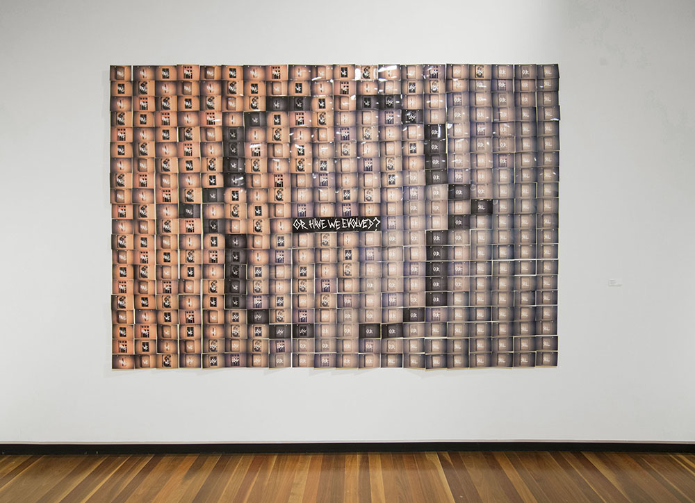 The individual pages of Jamian Stayt’s Soulless evolution are pinned to the wall making what may seem like a vast wallpaper pattern. However, Stayt’s work invites a closer reading of the cipher hidden within the layers of the image. He presents some big questions where contemporary notions of tradition are challenged and rapidly changing technology has intertwined agency in the evolutionary pathway for humanity.