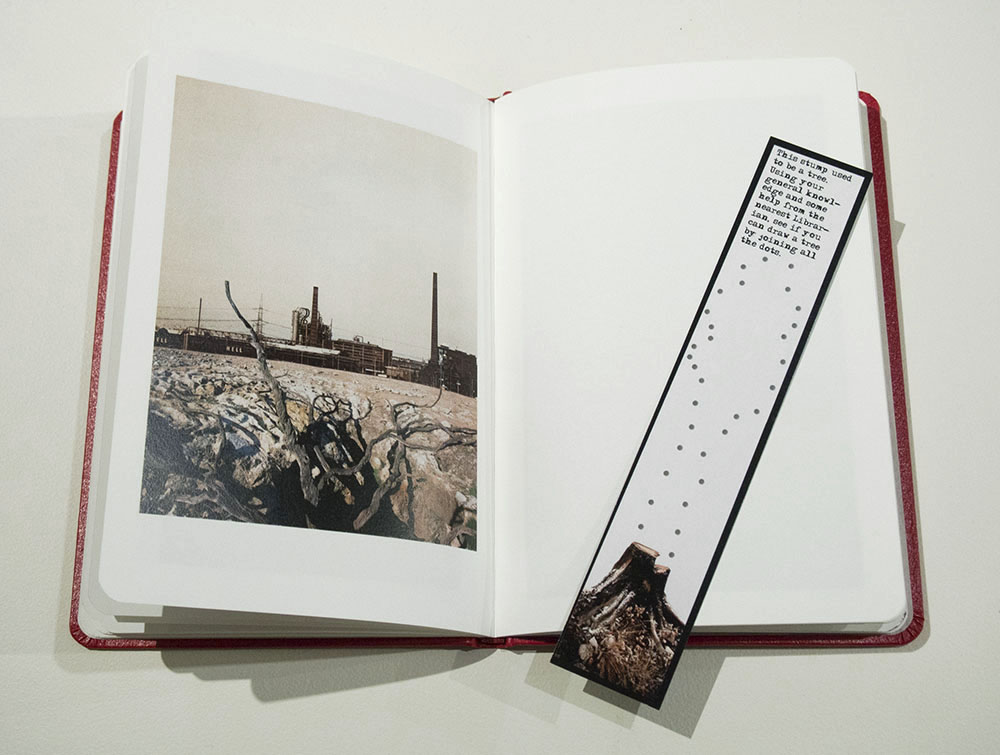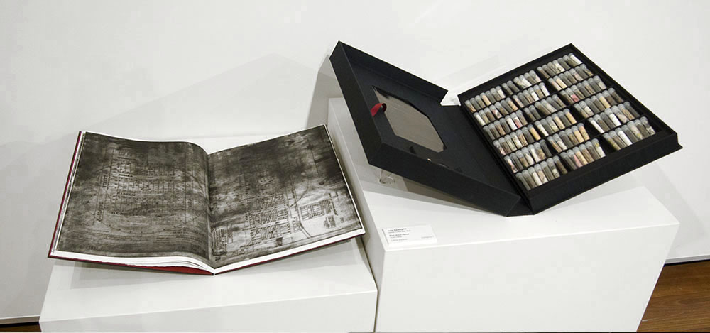 Julie Barratt’s Blair Athol recut refers to Solastalgia: a theory on the contemporary human condition for a deep loss of place. In one part of the installation there is a book of dark photolithographs where maps are encroached upon by black inks. For the reader this growing blackness evokes a gloomy absence. Facing the dark pages in the clamshell container are vials of coloured soils, plant fragments and found objects. Although collected from this disturbed place, these samples are vibrant and alive – perhaps they are the vestiges of childhood memories that recall a different time before the destruction of the physical place by coal mining.