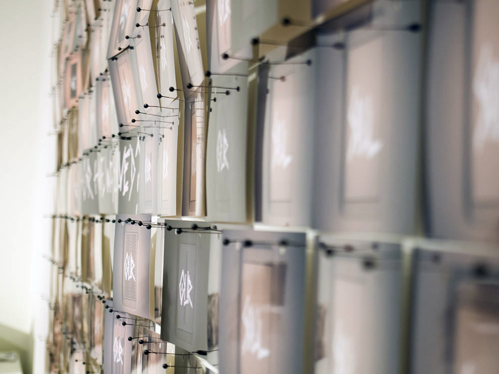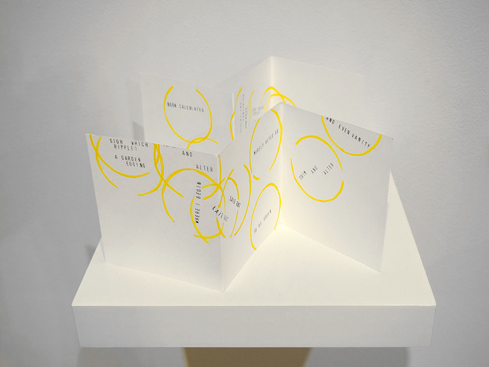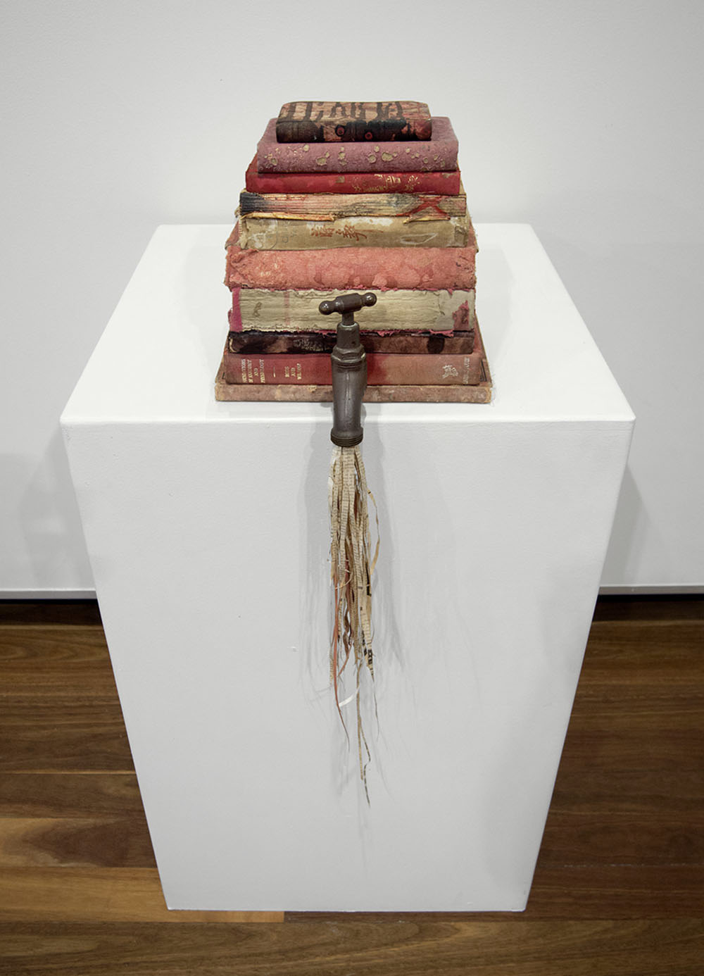 Visitors to Artspace and the Libris Awards encounter an open space with islands of book presentation devices. Plinths of all sizes – some encased, others at floor level, there are shelves on walls, books as mobile installations hung from the ceiling and other books with ‘pages’ covering large expanses of wall. This is not an easy walk-through exhibition as each work beckons, siren-like, calling for the extended gaze of the reader.