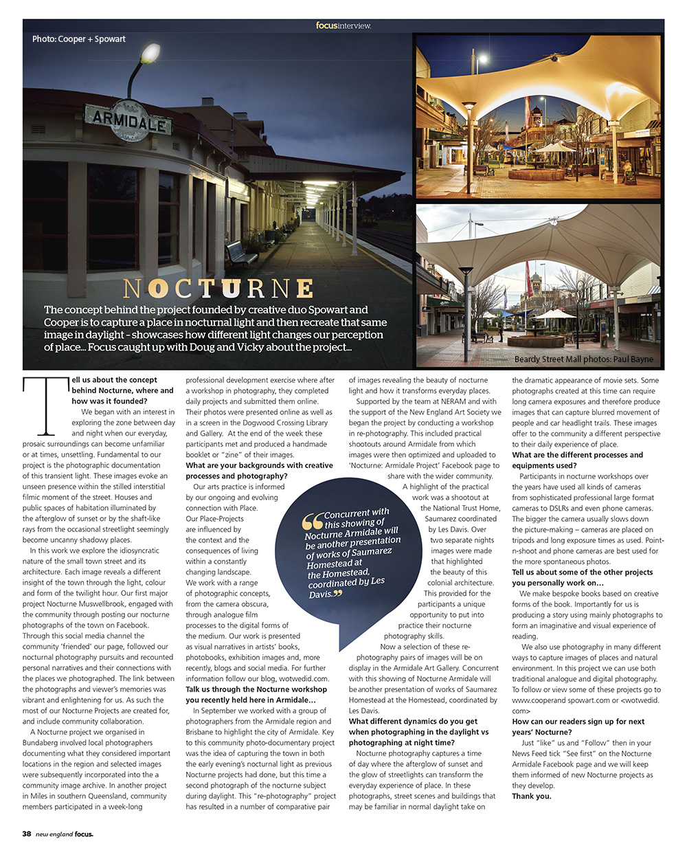The New England FOCUS Magazine published a story on our work and background to the Nocturne Armidale project – Download a PDF focus-nocturnearmidale-red (20Mb)