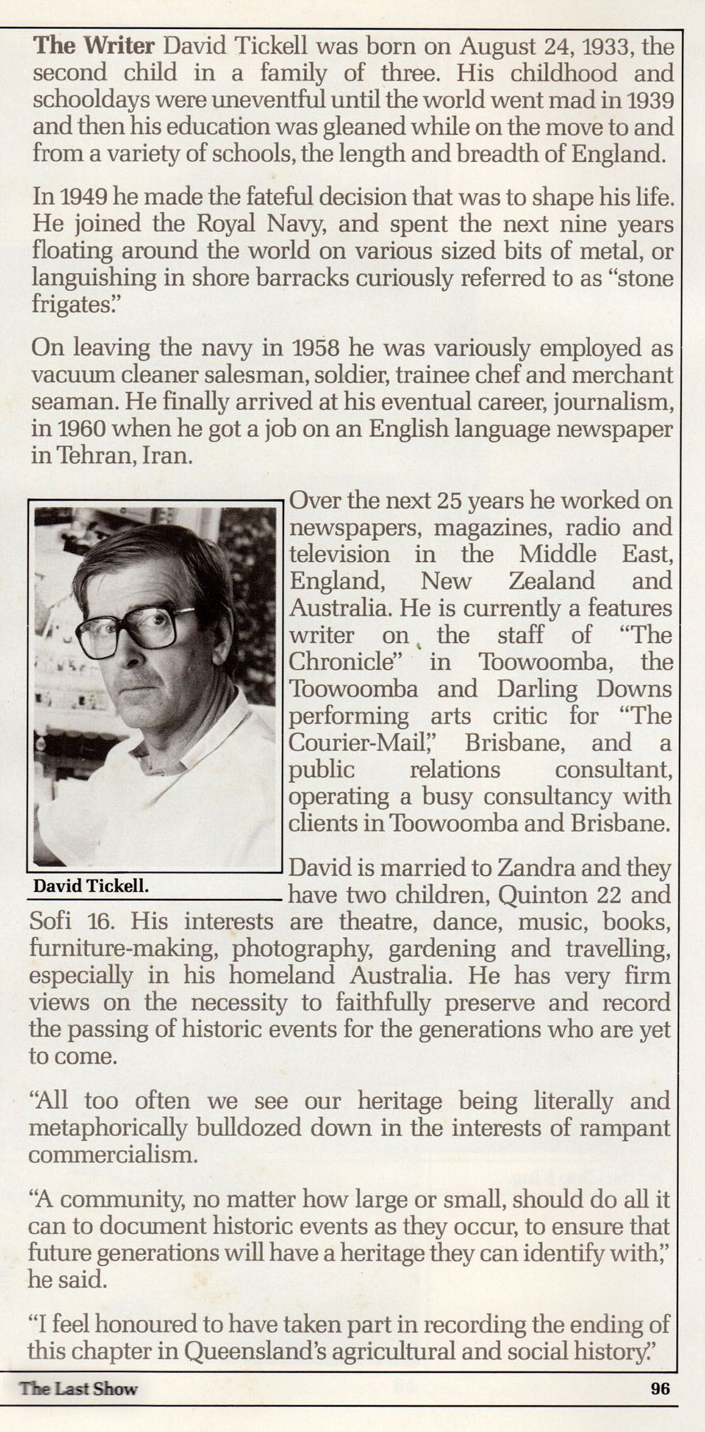 Words about David Tickell from John Elliot’s photographic documentary book The Last Show published in 1986. The book was about the last Toowoomba Agricultural Show held on the inner-city site bordering Bridge, Campbell and Lindsay Streets. Elliott’s photographs were complimented by a text telling the story of the show written by David.