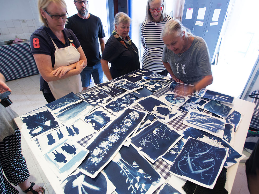 The weather was very changeable requiring some program shuffles, as cyanotypes are direct sun exposures for many minutes. Ah! Today is sunny – we’ll make cyanotypes then… Once participants grasped the technique each took the process in their own directions. Many sophisticated books were made based on other workshop classes in book binding and finishing. Some went BIG making full sheet (55x76cm) cyanotypes.