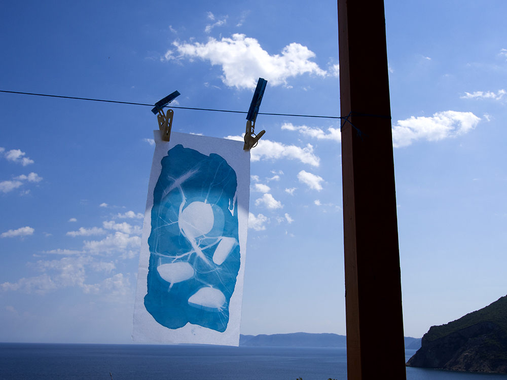 Key to the program was the concept of ‘place-making’, that is making photographs and forming them into themes and photo-essays that told of the personal experience of place by the photographer. The process of the cyanotype was explored employing traditional ‘shadow’ imprint of objects collected from the island to some very experimental work with multiple materials and exposures and double-sided printing. We worked not only with art papers but also with rice paper, various cloth materials event kitchen paper towelling. We had also gathered some special objects like a range Greek laces and linens, local rocks and a diverse range of plant material. Connecting direct photography with the cyanotype process was achieved on-site by the making of enlarged inkjet negatives.