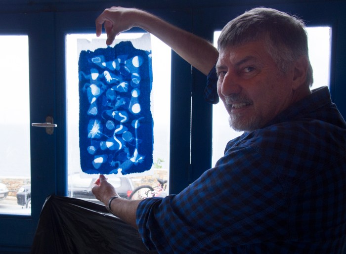 Doug with his cyanotype transparency at the Skopelos Greece workshop