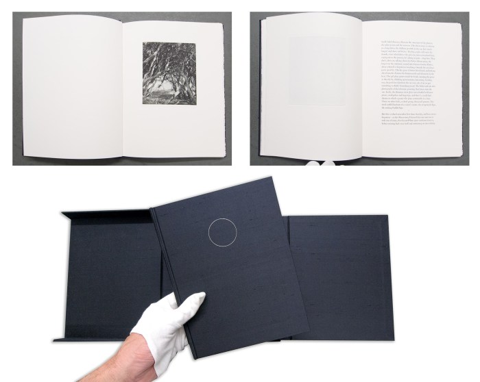 - Texts are usually handset letterpress, photographs made by traditional photo etching or gravure techniques and binding and presentation in cloth and leather often with ‘book arts’ embellishments;