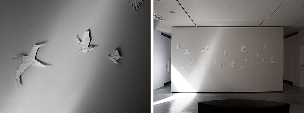 Across the room in a free flowing formation is a flock of birds and one butterfly in flight, All flying, all right, drawn by the sensitive hand of Louise Jennison. Serendipitously, in the gallery space at certain times of the day, a streak of sunlight falls across the wall and seems to guide the birds as a reference to the exhibition title. In this gallery space these works form a kind of habit for the reimagining of the fragile relationship between humans and animals.