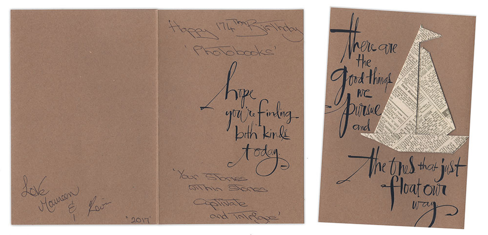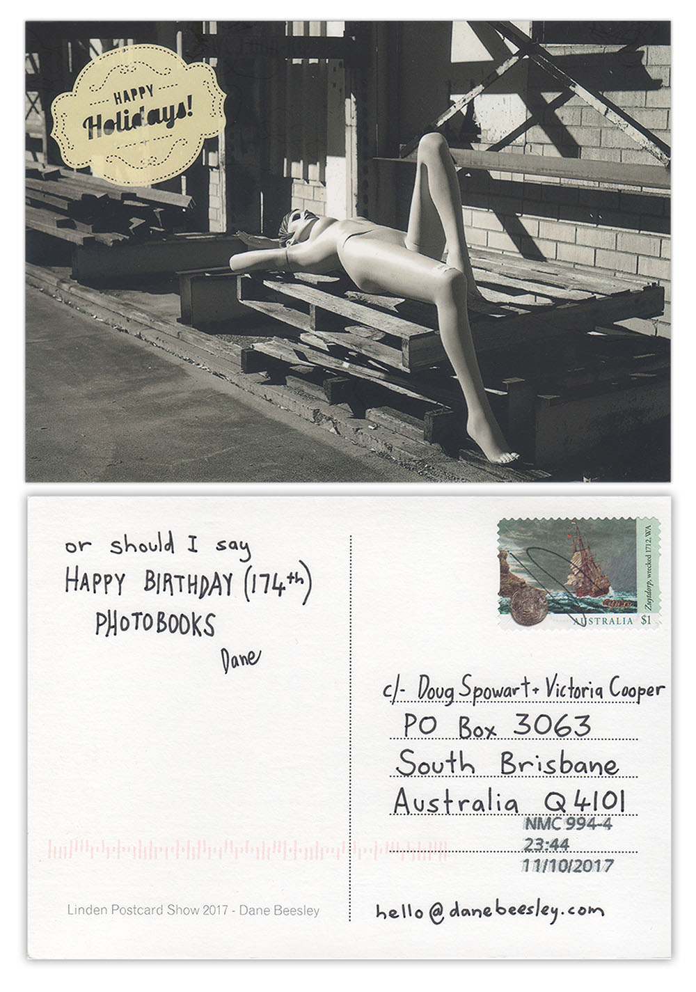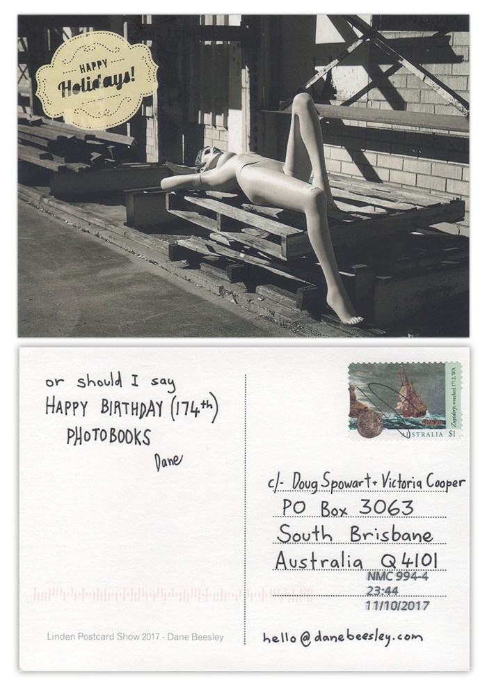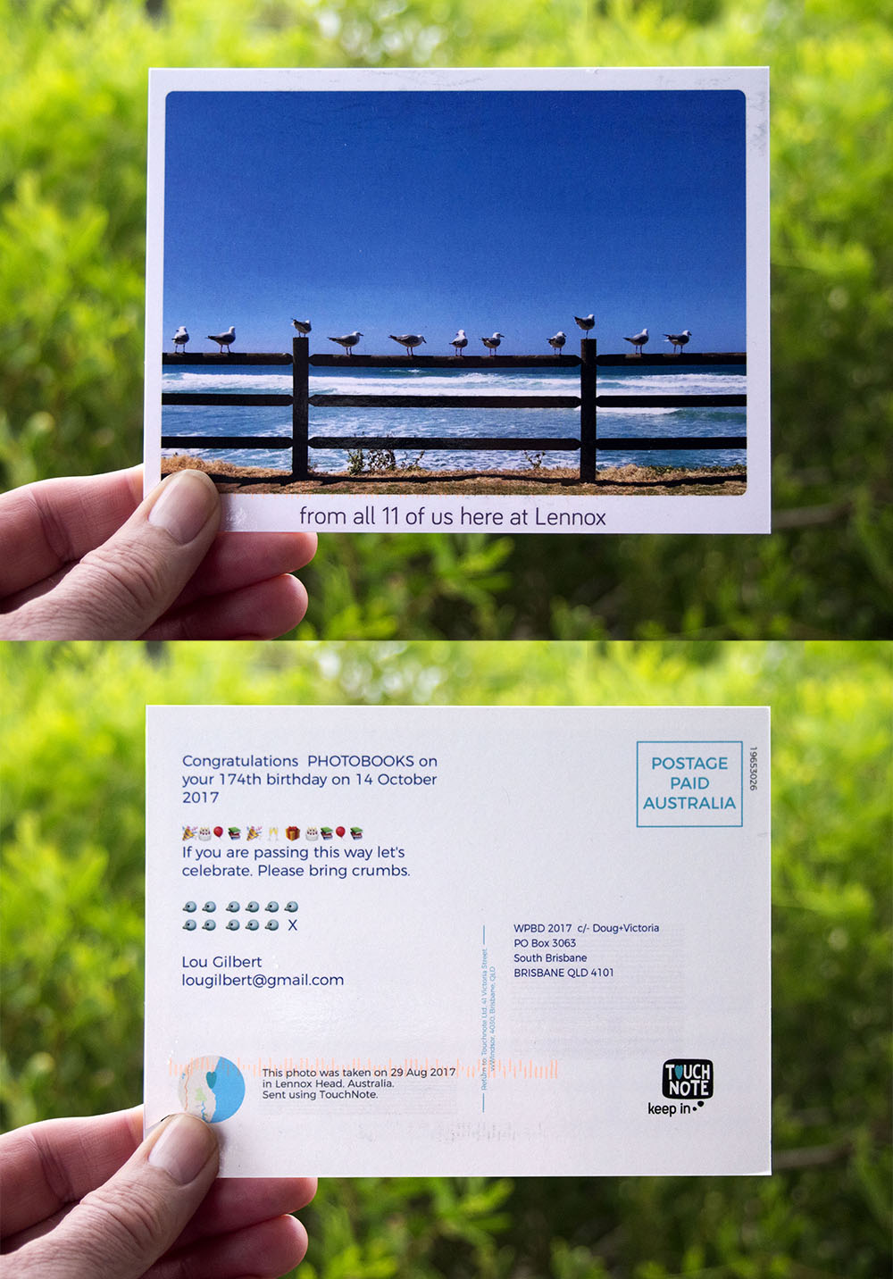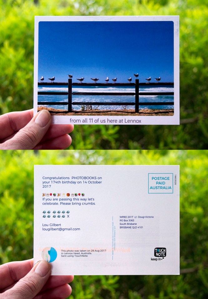Each year we try to coordinate our own event at the Photobook Club Brisbane – (See past year’s events at the end of this post). This year’s (2017) WPBD project was a request for photobook people to send to us “A Birthday Card” to celebrate the occasion.