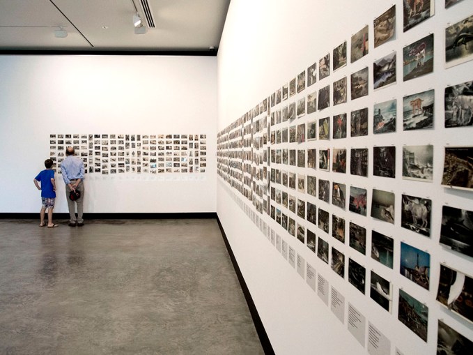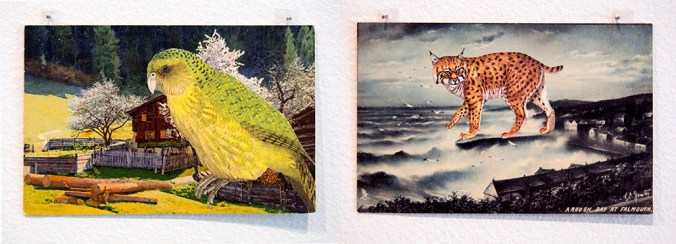 The wall works, All breathing, all right, are a breathtaking 446 collages constructed on to antique postcards by Haby from 2006 to 2015. Overwhelming to take in on one visit these transformed postcards are regimented into columns that disrupt a formal ‘reading’ by left to right or of the entire work at once. Instead one discovers them individually, up close and at random bringing a kind of child play or ‘I spy’ to the engagement of this work.
