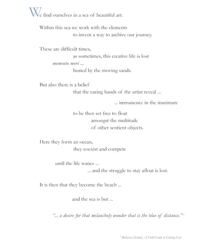 These objects as image elements, no longer in their original form, are woven together as if a poem, song or dance. In many ways TIDAL relates to a ‘desire for that melancholy wonder that is the blue of distance’ from Rebecca Solnit’s A field guide to getting lost. Or just simply it could be about the artist and their art.