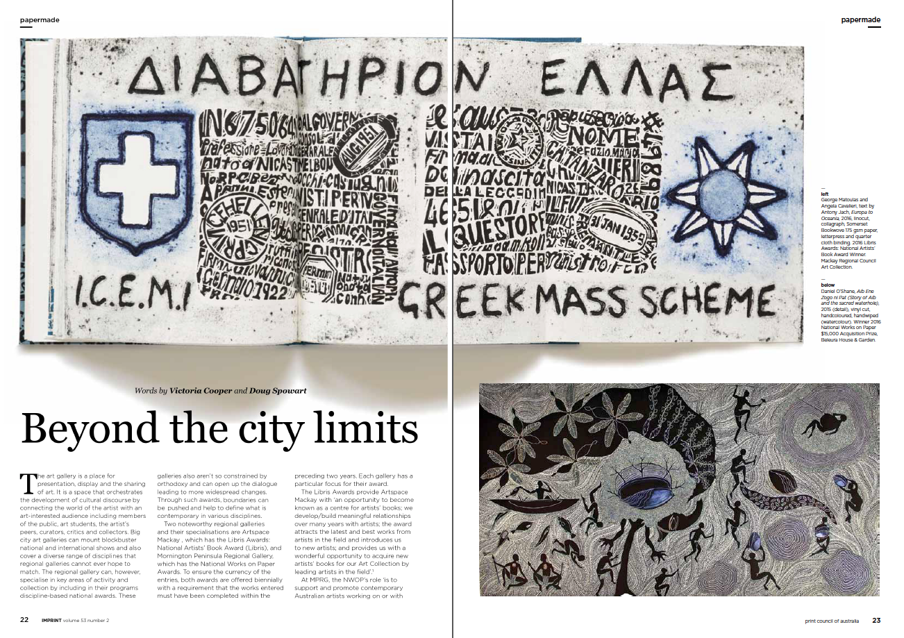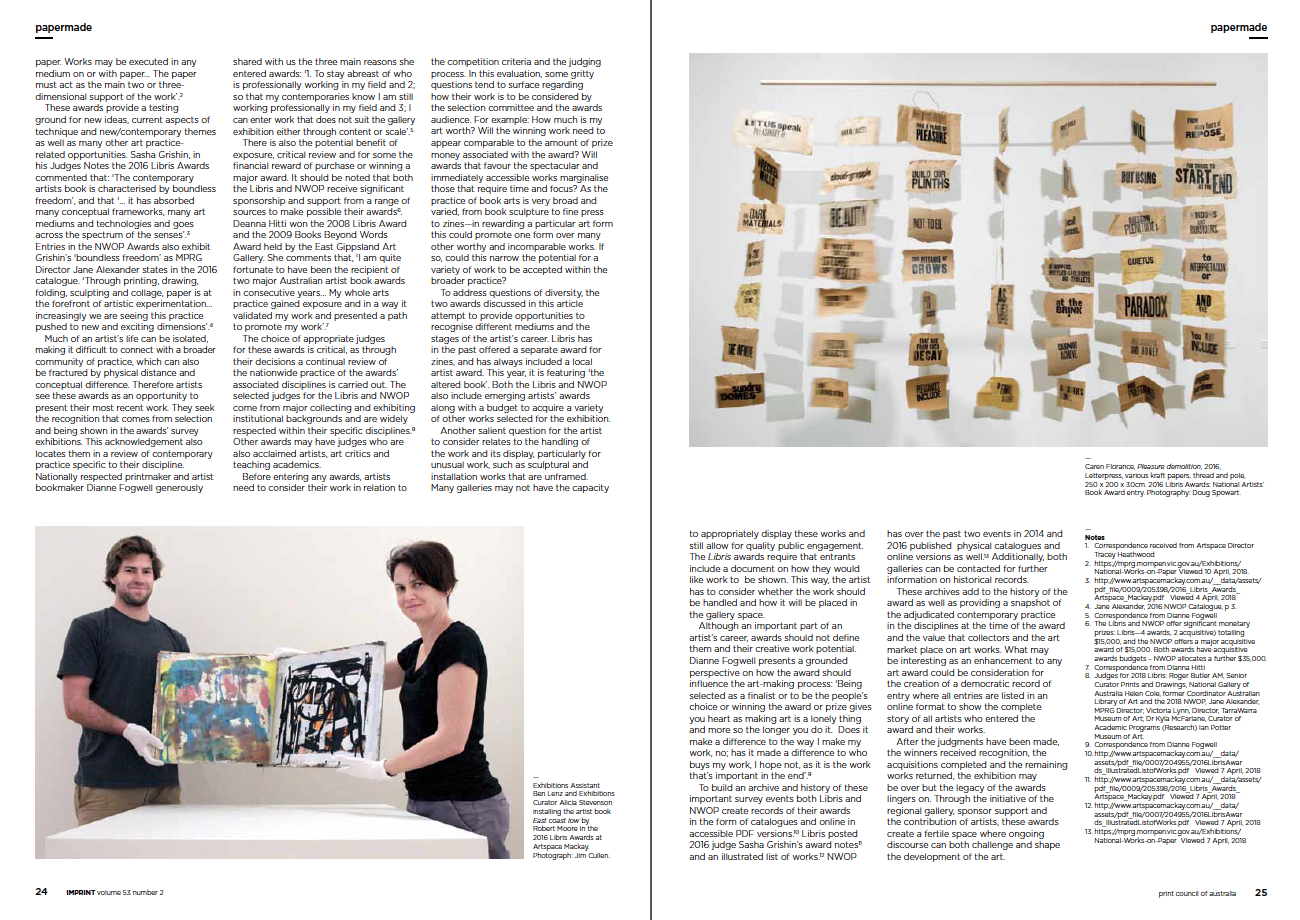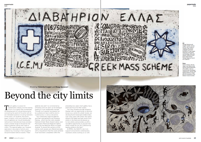 In March this year we were approached by the Editor of IMPRINT MAGAZINE, the journal of the Print Council of Australia to write a piece about regional galleries and the national awards that they coordinate. Of particular interest to Editor Andrew Stephens was Artspace Mackay’s Libris Awards: National Artists’ Book Award, and Mornington Peninsula Regional Gallery’s National Works on Paper Awards.