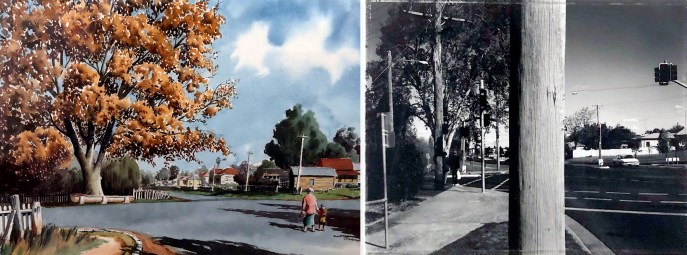 Don Featherstone (L) Golden Tree (Corner of Kitchener and Herries Streets)1959 watercolour Spowart+Cooper (R) Corner of Kitchener and Herries Streets 1996 silver gelatin fibre print