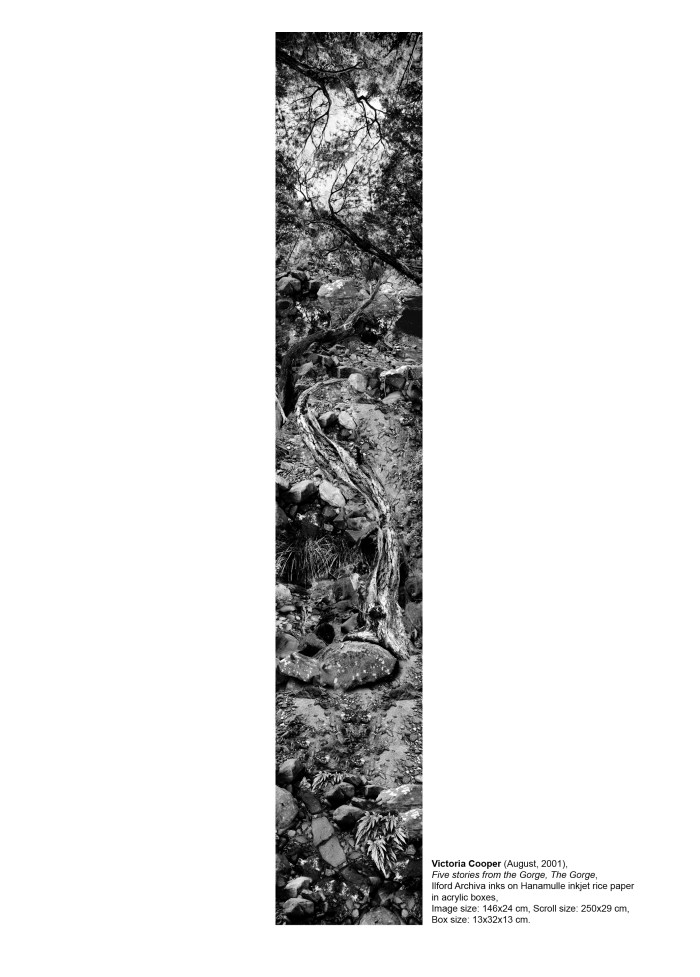 Following this initial work I became more interested with the concept of small and intimate spaces found in everyday life. Five stories from the Gorge, presents a more intimate connection with the environment than the Buffalo series. Instead of trekking up precipitous climbs of distant mountain regions, I followed forgotten pathways and looked into the small, enclosed spaces of this gorge environment near where I lived. I made many journeys into the gorge and on each occasion I took time to absorb many sensory impressions as well as creating a digital photographic record.