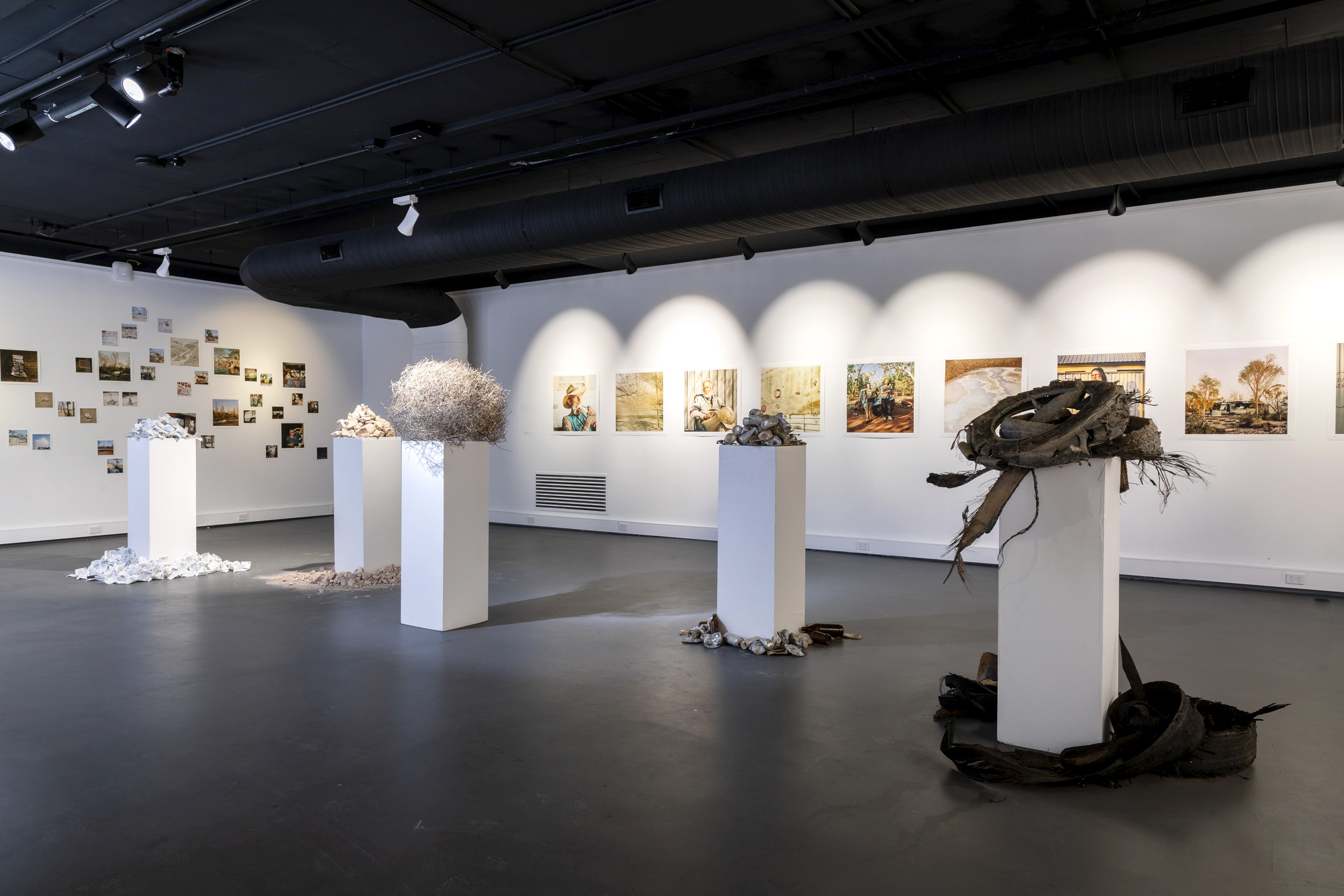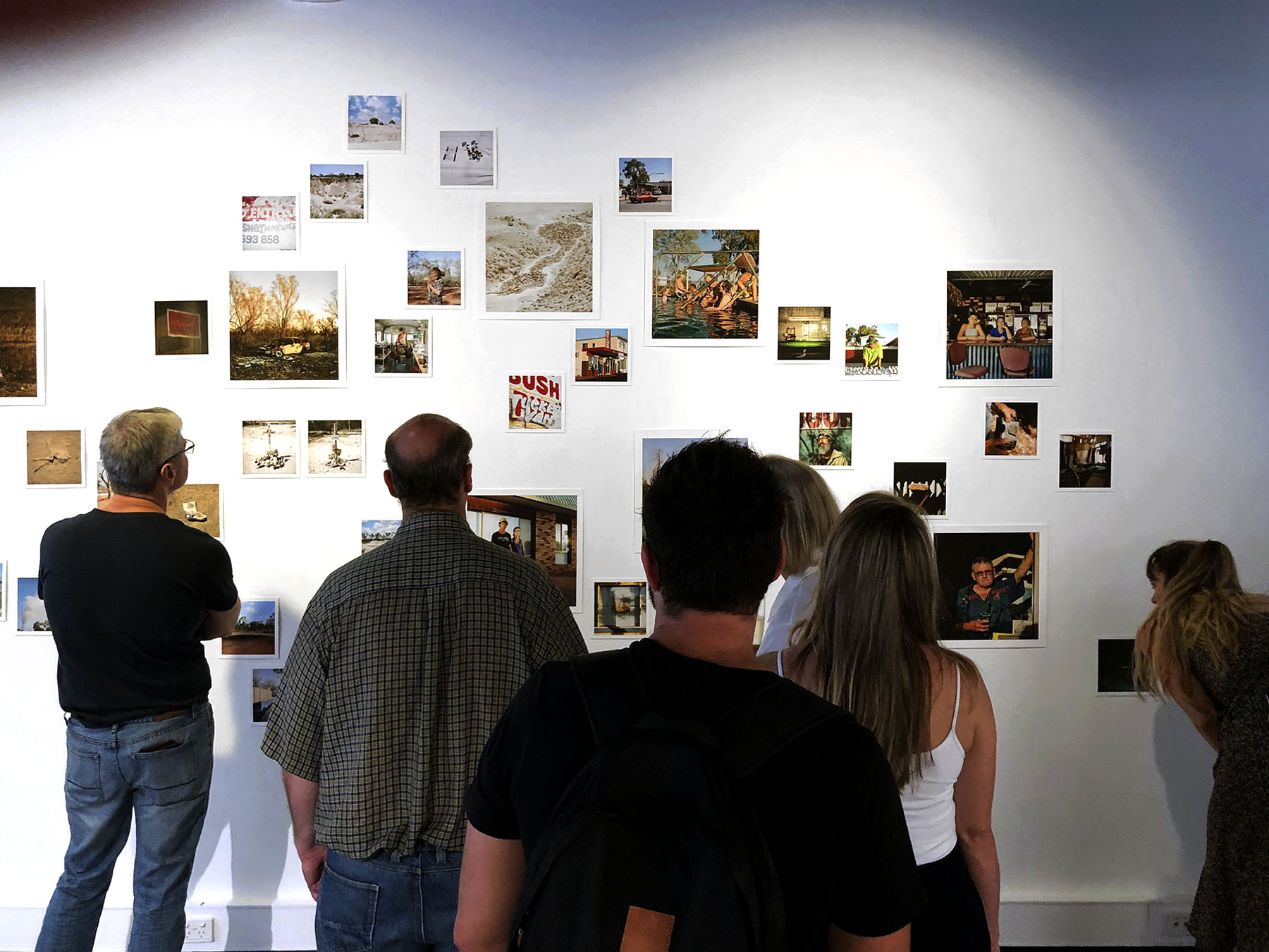 The white walls of the gallery evoke the opal miner’s white clay tunnels of Lightning Ridge in northern NSW. Here and there the glimmer of what opal miners call ‘colour’ appear in the form of photographs arranged in rows and in one random gallery hang.
