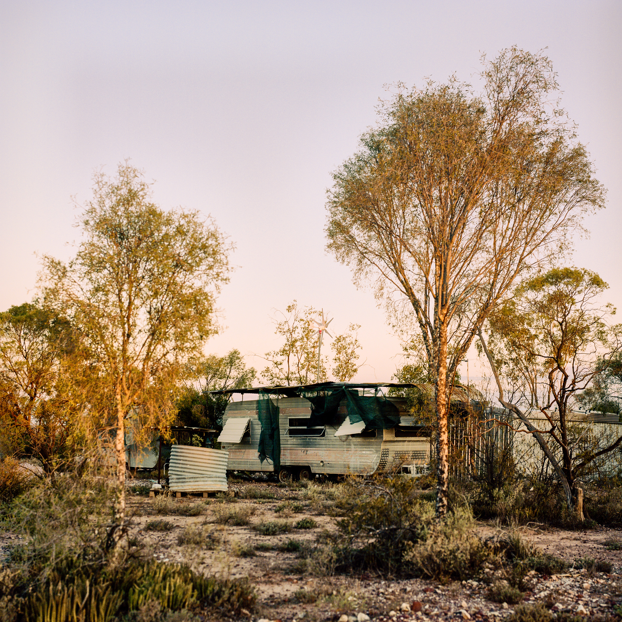 - A caravan surrounded by assorted re-purposed corrugated iron sheeting hides within a barren withered land.