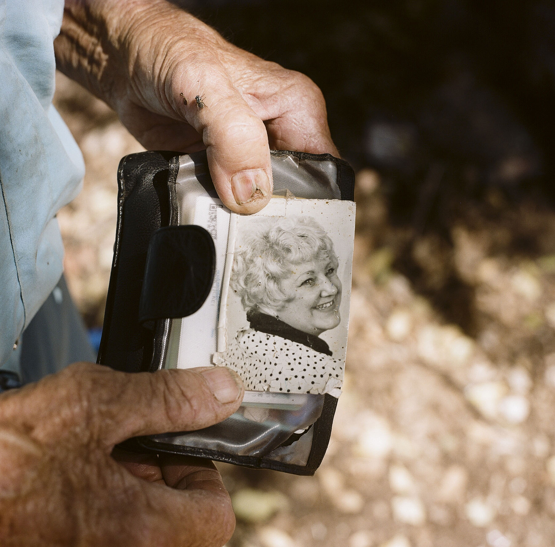- A hand holds a wallet in which a well-handled 1960s b&w portrait of lady looks out of the frame – the thumbnail of the hand is damaged and cracked and a fly sits on the knuckle…