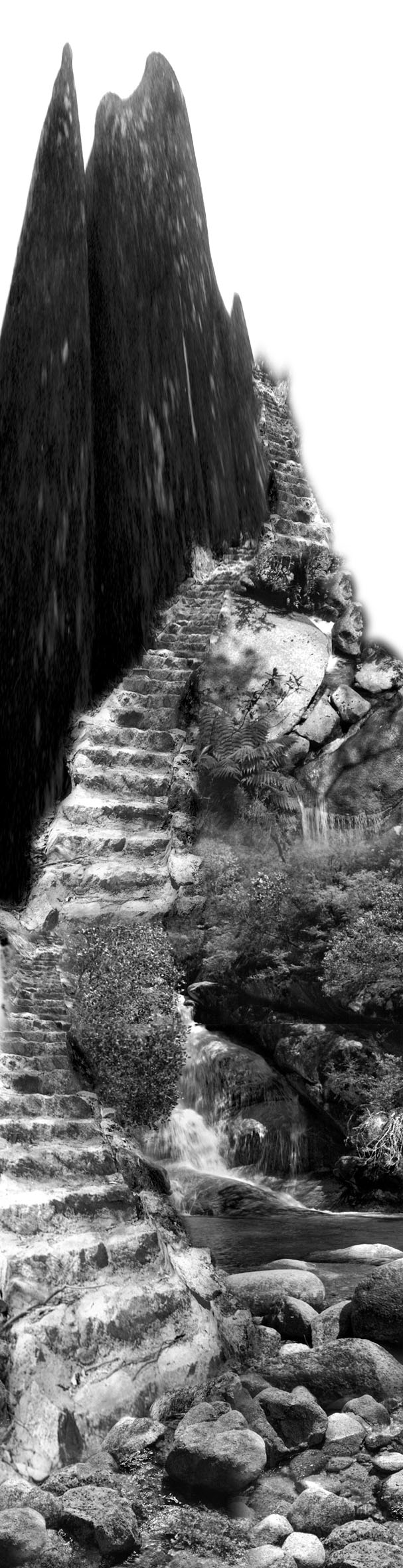 The digital environment provided me with a psychological space in which images could be combined, manipulated and layered in the shaping of my story. I utilised image manipulation software to ‘grow’ and distort the landscape. Through this process I found that I was directed to imaginative places beyond any original intent or pre-visualization. Although the work originates in my direct recordings of place, the fluidity of digital space allowed for experimentation and new work to transform and evolve any fixed idea I may have had. So in creating The Waterfall scroll, a large boulder became a precipitous mountain to emphasis the terrain encountered. The trail up to the waterfalls was a seemingly endless rock-formed staircase that proved to be a challenging path.