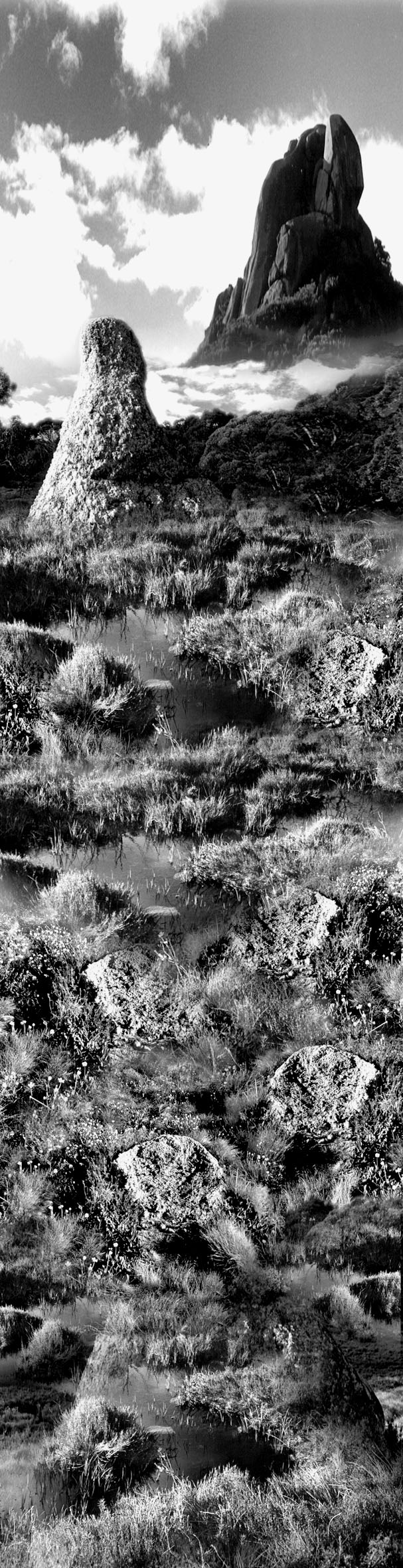 When I first encountered the landscape at Mount Buffalo, I was filled with a sense of awe. The most significant memories that remain with me are of the journeys from the valley to the summit. Over the years I have undertaken many walks that meander through or climb impressive granite landforms and rich stands of native flora. The Buffalo Scrolls were constructed from many individual elements of the analogue photographic material gathered on site and woven together in the computer later. Although initially informed by the tradition of Chinese and Japanese scroll making, I could not conform to the strict rituals of Asian art school but rather was guided in the production of these works by material thinking and the reflective/reflexive response to memory and corporeal experience.