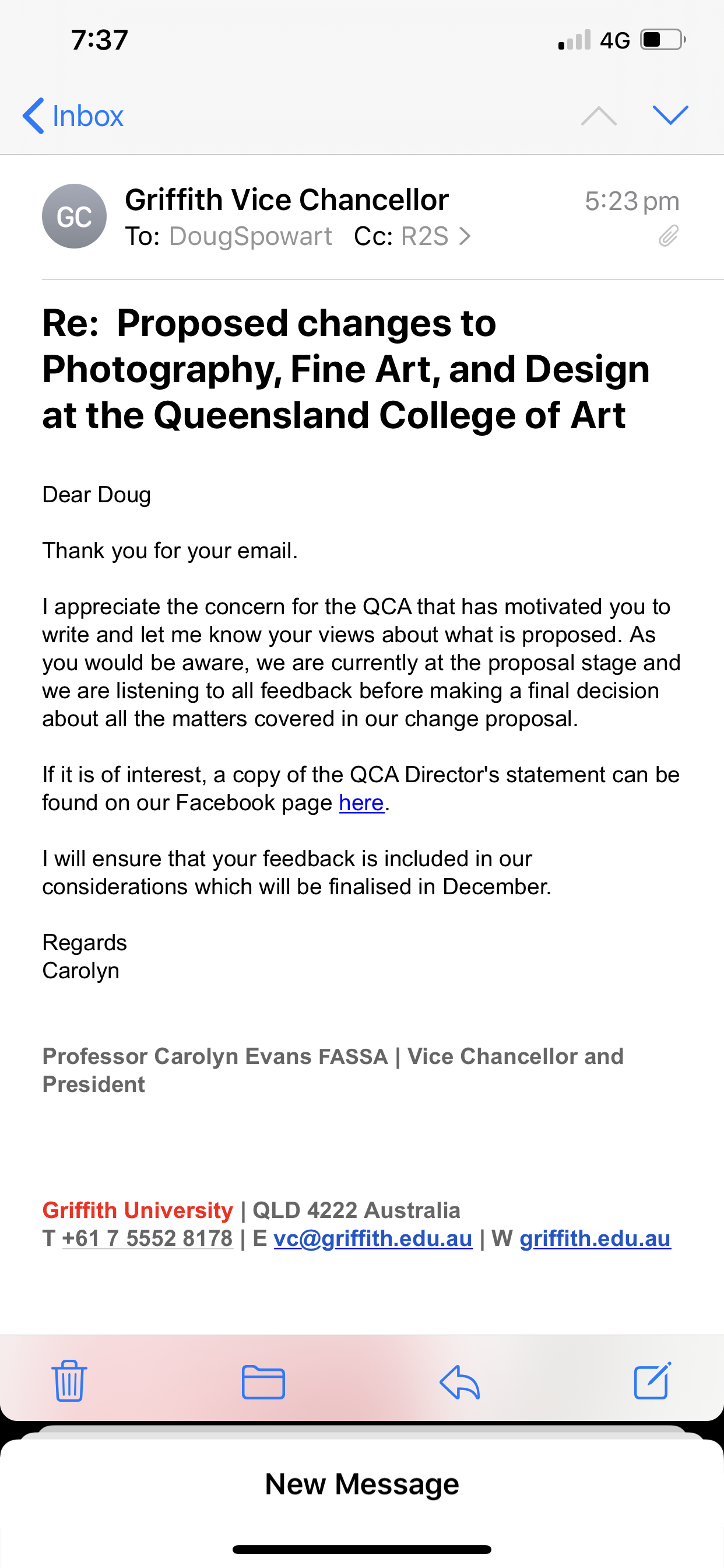 By now you will have received a significant number of responses relating to the proposed changes to the Queensland College of Art.
